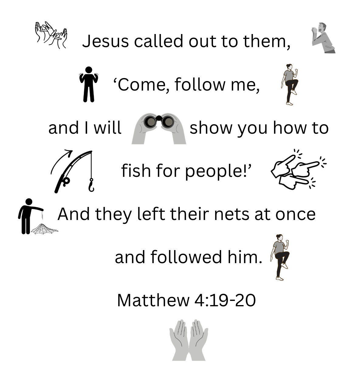 “Jesus called out to them, ‘Come, follow me, and I will show you how to fish for people!’ And they left their nets at once and followed him.”